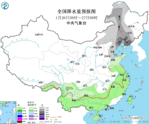 1月24日至27日,本年首场寒潮天气进程赓续影响我国,中东部大部地区将不时出现雨雪天气,西北地区东部、华北、东北等地局部有暴雪。朔方多地累计降温幅度可达14℃以上,华北、黄淮部分地区最低气温或低于零下10℃。偶合春运岑岭期,公众请疑望防寒御寒,雨雪天气出行需寄望交通安全。