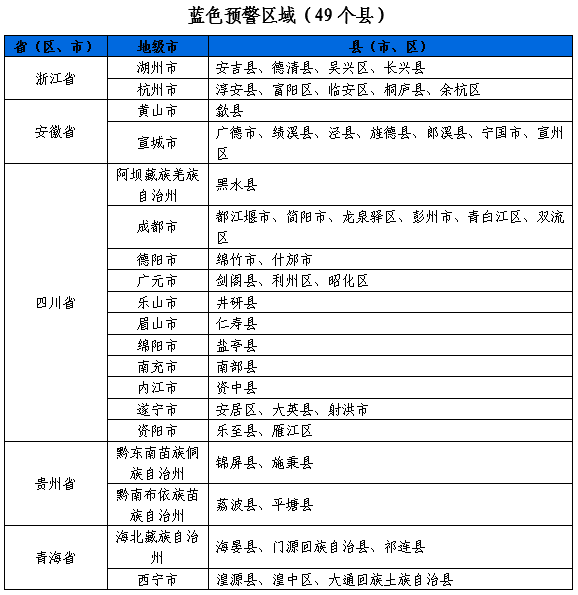 瞻望,6月28日20时至6月29日20时,四川北部、贵州东南部、甘肃南部等地部分地区发生山洪灾害可能性较大(黄色预警),局地发生山洪灾害可能性大(橙色预警),预警区域波及的县(市、区)见下表。其他地区也可能因局地短历时强降水激励山洪灾害,请各地扫视作念好及时监测、防汛预警和转换避险等防护责任。